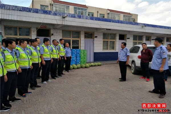 西部決策網(wǎng)訊( 鄒坤 通訊員 崔春月) 時(shí)值夏日,天氣持續(xù)高溫,2016年8月10日下午,靖邊縣公安局黨委委員、交警大隊(duì)長(zhǎng)王世崗、辦公室主任黃瑞峰等一行來(lái)到該大隊(duì)城區(qū)二中隊(duì)慰問(wèn)在高溫酷熱天氣下堅(jiān)守崗位的一線民警,深刻表達(dá)了大隊(duì)黨委對(duì)一線民警的關(guān)心和關(guān)愛(ài),并將防暑降溫物品及時(shí)送到了一線民警手中。