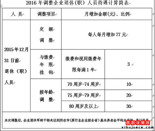根據(jù)國家規(guī)定,2016年調(diào)整退休人員基本養(yǎng)老金,采取定額調(diào)整、掛鉤調(diào)整與適當(dāng)傾斜相結(jié)合的辦法。定額調(diào)整重點(diǎn)體現(xiàn)社會(huì)公平。掛鉤調(diào)整要體現(xiàn)“多工作、多繳費(fèi)、多得養(yǎng)老金”的激勵(lì)機(jī)制,可與退休人員本人繳費(fèi)年限(或工作年限)、基本養(yǎng)老金水平等因素掛鉤。企業(yè)應(yīng)兼顧繳費(fèi)年限掛鉤和基本養(yǎng)老金水平掛鉤,體現(xiàn)長繳多調(diào)、多繳多調(diào)。機(jī)關(guān)事業(yè)單位可主要與養(yǎng)老金水平掛鉤,也可以考慮工作年限、職務(wù)職級等因素,但不宜簡單按職務(wù)職級確定具體標(biāo)準(zhǔn)。對高齡退休人員可適當(dāng)提高調(diào)整水平。對基本養(yǎng)老金偏低的企業(yè)退休軍轉(zhuǎn)干部,繼續(xù)確保其基本養(yǎng)老金不低于當(dāng)?shù)仄髽I(yè)退休人員平均水平。