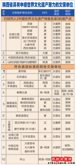 依據(jù)世界申遺遴選標(biāo)準(zhǔn),結(jié)合陜西省遺產(chǎn)實際狀況與保護(hù)現(xiàn)狀,選定了兩大類文物點,第一類是已經(jīng)列入《中國世界文化遺產(chǎn)預(yù)備名單》的文化遺產(chǎn),共4處16個文物點;第二類是《陜西省申報世界文化遺產(chǎn)工作規(guī)劃》列入的擬申報遺產(chǎn)點,包括漢唐帝陵、石峁遺址、黃帝陵、周原及豐鎬遺址、秦蜀古道(蜀道)、秦都城及陵墓遺址、玉華宮遺址、秦直道遺址、中國漢傳佛教祖庭、華山等10處44個文物點。