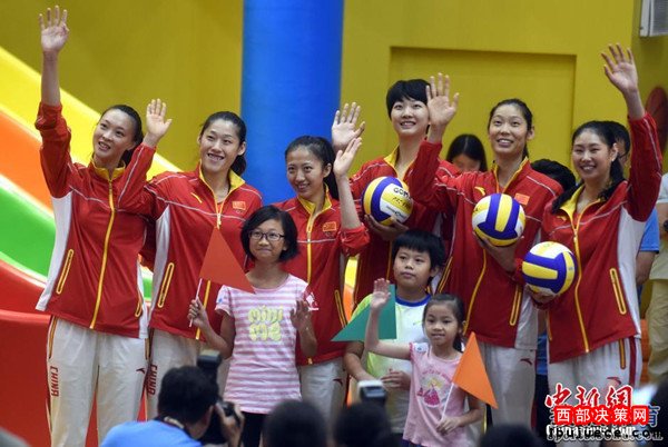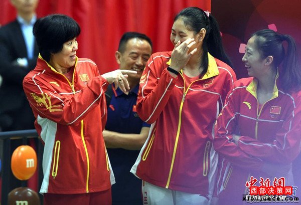 北京時(shí)間8月28日,女排隊(duì)員在香港與市民見面。見面會(huì)上女排姑娘與當(dāng)?shù)貎和M(jìn)行了互動(dòng)游戲,女排主教練郎平幽默扮鬼臉令人捧腹大笑。