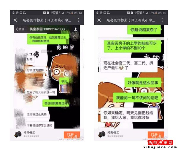 近日,一則題為《延安微信招生(3.2萬(wàn)保上新城小學(xué))請(qǐng)相關(guān)部門(mén)給予調(diào)查公布真相》的帖子在朋友圈瘋傳,內(nèi)容是一位微信名叫“延安微信招生(保上新城小學(xué))”的微友,聲稱(chēng)只要花3.2萬(wàn)元,保證可以在新區(qū)小學(xué)入學(xué),并解釋有中間人,錢(qián)并不是直接給校長(zhǎng)王紅霞,但愿意提供自己的車(chē)號(hào)、身份證號(hào)、家庭住址等信息作為擔(dān)保。3.2萬(wàn)真的能夠保上延安新區(qū)小學(xué)嗎?事情真相究竟如何,記者展開(kāi)調(diào)查。
