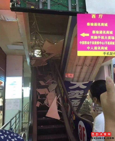 (通訊員 展?。?nbsp;今天中午1點(diǎn)左右,西安市西華門海星智能廣場(chǎng)四樓賣場(chǎng)電梯頂?shù)蹴斖蝗幻撀?。商戶們說,房頂是木質(zhì)結(jié)構(gòu),坍塌毫無預(yù)兆。事故所幸暫時(shí)沒有人員受傷!