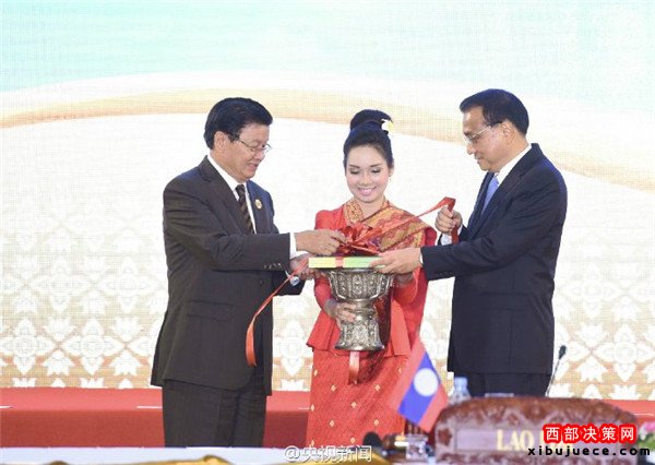 李克強(qiáng)總理7日同東盟10國領(lǐng)導(dǎo)人在老撾萬象共同出席中國—東盟建立對話關(guān)系25周年紀(jì)念儀式。觀看紀(jì)錄短片、發(fā)布對話合作事實(shí)與數(shù)據(jù)手冊后,李克強(qiáng)與東盟主席國老撾總理通倫、中國東盟關(guān)系協(xié)調(diào)國新加坡總理李顯龍?jiān)谂c會各國領(lǐng)導(dǎo)人見證下一起切蛋糕。