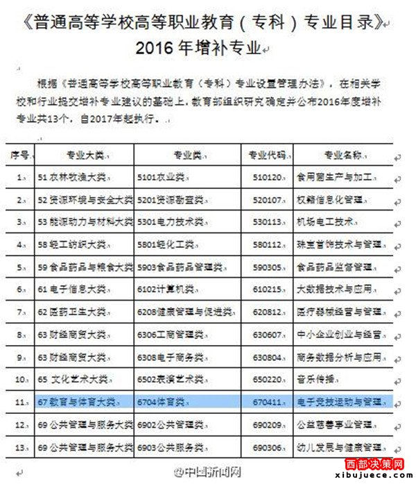 近日,教育部發(fā)布《普通高等學(xué)校高等職業(yè)教育(??疲I(yè)目錄》2016年增補專業(yè),公布了13個新增專業(yè),其中包括“電子競技運動與管理”,屬體育類。新增專業(yè)適用于高等職業(yè)學(xué)校,將于2017年實行。