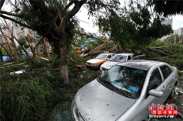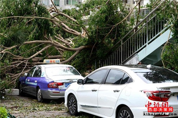 9月15日,今年第14號臺風(fēng)“莫蘭蒂”于凌晨3時(shí)05分在廈門翔安沿海登陸,登陸時(shí)中心附近最大風(fēng)力15級(48米/秒,強(qiáng)臺風(fēng)級),中心氣壓945百帕。圖為廈門市區(qū)大批車輛被吹倒的樹木損壞。