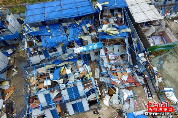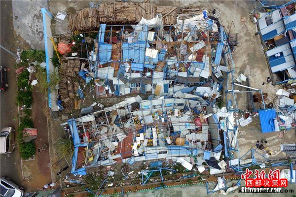 9月15日,今年第14號臺風(fēng)“莫蘭蒂”于凌晨3時(shí)05分在廈門翔安沿海登陸,登陸時(shí)中心附近最大風(fēng)力15級(48米/秒,強(qiáng)臺風(fēng)級),中心氣壓945百帕。圖為航拍登陸點(diǎn)翔安一工地工棚被完全摧毀。