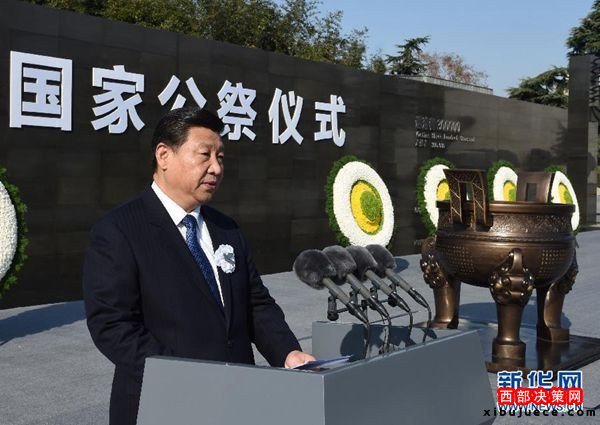 2014年12月13日上午,中共中央、全國(guó)人大常委會(huì)、國(guó)務(wù)院、全國(guó)政協(xié)、中央軍委在南京隆重舉行南京大屠殺死難者國(guó)家公祭儀式。中共中央總書記、國(guó)家主席、中央軍委主席習(xí)近平出席并發(fā)表重要講話。
