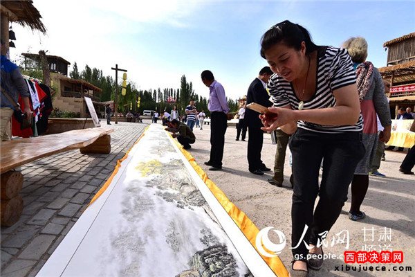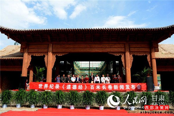 19日上午,在首屆絲綢之路(敦煌)國際文化博覽會召開之際,由敦煌正覺寫經(jīng)院打造的篆刻《道德經(jīng)》百米長卷在敦煌月牙泉小鎮(zhèn)亮相,“獻(xiàn)禮”文博會。