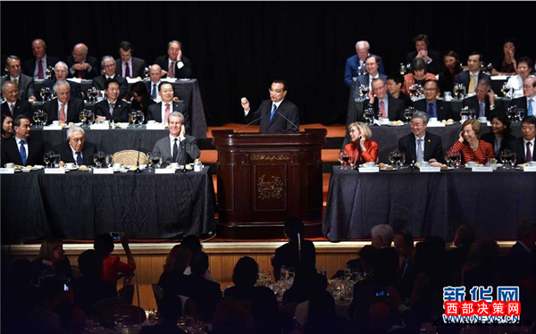 李克強(qiáng)出席紐約經(jīng)濟(jì)俱樂部舉行的歡迎宴會(huì)并致辭和回答提問