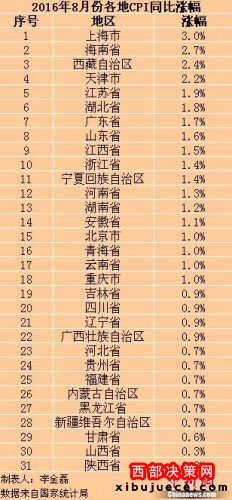 在31個(gè)省份中,上海8月份CPI漲幅全國最高,為3.0%,漲幅比7月回落0.4個(gè)百分點(diǎn)。數(shù)據(jù)顯示,上海CPI漲幅自今年3月份開始已連續(xù)6個(gè)月處于“3時(shí)代”。陜西和山西8月份CPI漲幅僅為0.3%,為全國最低。