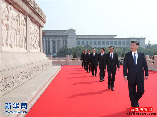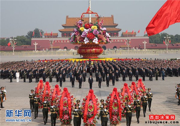 9月30日上午,黨和國(guó)家領(lǐng)導(dǎo)人習(xí)近平、李克強(qiáng)、張德江、俞正聲、劉云山、王岐山、張高麗等來(lái)到北京天安門(mén)廣場(chǎng),出席烈士紀(jì)念日向人民英雄敬獻(xiàn)花籃儀式。這是習(xí)近平整理花籃上的緞帶。新華社記者鞠鵬攝