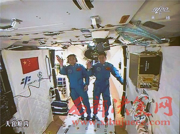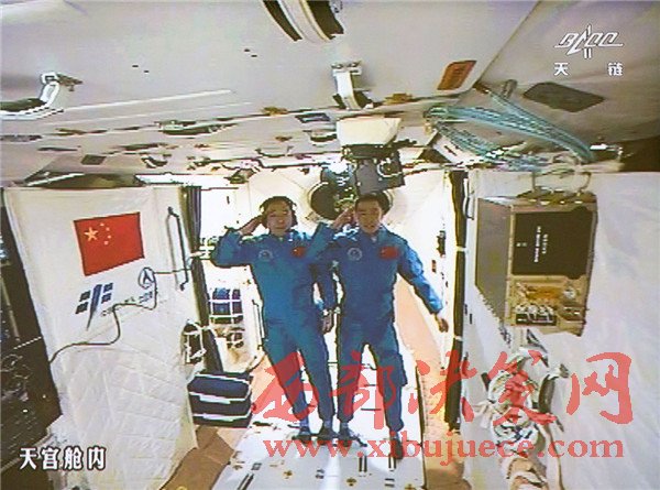 10月19日,神舟十一號(hào)航天員景海鵬和陳冬順利進(jìn)入天宮二號(hào)實(shí)驗(yàn)艙。景海鵬(左)和陳冬在天宮二號(hào)實(shí)驗(yàn)艙向全國(guó)人民問好并敬禮(攝于北京航天飛行控制中心大屏幕)。