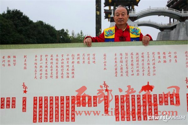 呂國嶺用了整整一個月時間,把《長征組歌》和毛主席《沁園春.雪》中的字剪成陰陽字,再將剪好的陰文和陽文裝裱好,組成一幅15米長的《長征組歌》,巨幅剪紙中還有毛主席、朱總司令、紅五星、寶塔山等圖案。呂國嶺說他是聽著《長征組歌》長大的,長征精神一直激勵著他,為紀(jì)念紅軍長征勝利80周年,他用他的巧手剪出了巨幅剪紙作品《長征組歌》。