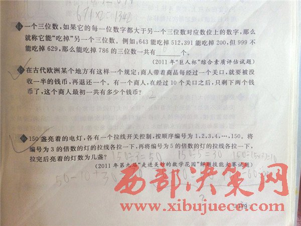 “150盞亮著的電燈,各有一個(gè)拉線(xiàn)開(kāi)關(guān)控制,被順序編號(hào)為1,2,3,4,…,150。將編號(hào)為3的倍數(shù)的燈的拉線(xiàn)各拉一下,再將編號(hào)為5的倍數(shù)的拉線(xiàn)各拉一下,拉完后亮著的燈數(shù)為幾盞?”這是一道考公因數(shù)和公倍數(shù)的思維數(shù)學(xué)題,今年暑假,才上完三年級(jí)的羅弋在做四年級(jí)的數(shù)學(xué)競(jìng)賽題集《培優(yōu)新幫手》時(shí)遇到此題,算出答案“90”與標(biāo)準(zhǔn)答案“80”不符,媽媽陳群只當(dāng)兒子錯(cuò)了。