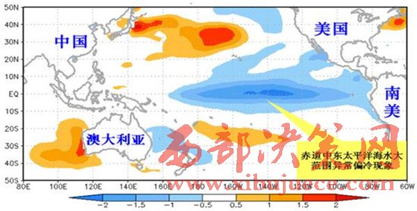 拉尼娜事件發(fā)生時海水表面溫度距平分布示意圖。(紅色表示偏暖,藍(lán)色表示偏冷,顏色越深表示偏暖或偏冷程度越強)