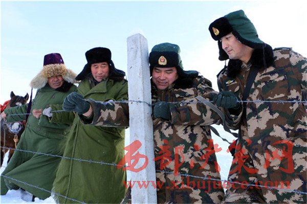 庫爾特邊防派出所官兵與護邊員修補損壞的鐵絲網。
