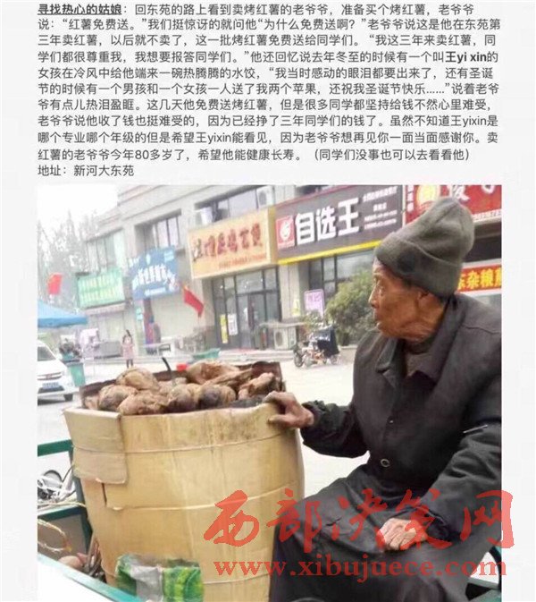 據(jù)了解,這位老人已經(jīng)80多歲,在河南大學新校區(qū)東苑賣了三年的烤紅薯了,對買紅薯的學生們時常優(yōu)惠,在冬天也會叫上受凍的學生在他烤紅薯的火爐邊取暖。