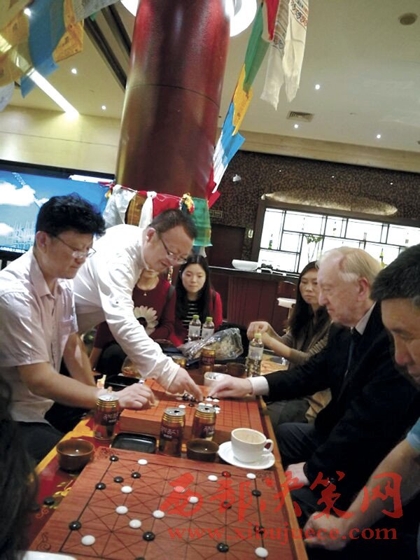 阿旺邊巴(左一)與外國(guó)藏棋研究學(xué)者交流藏棋文化。