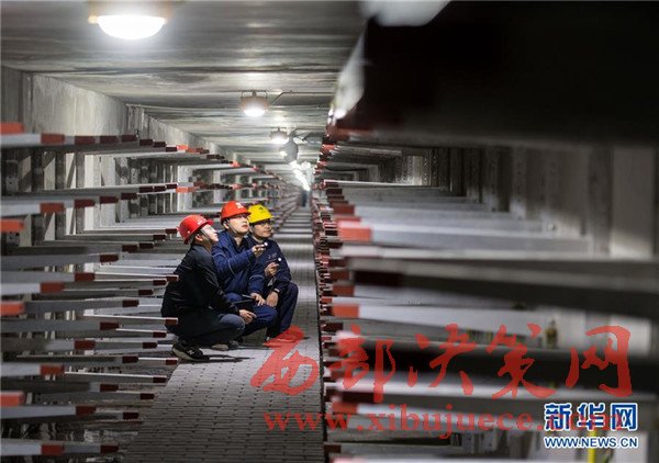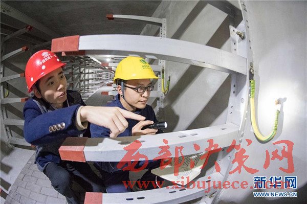 11月24日,解放碑地下環(huán)形電力隧道的一段支線電力隧道內(nèi),兩名國(guó)網(wǎng)重慶市區(qū)供電公司的技術(shù)人員(右一、右二)在對(duì)預(yù)留的商業(yè)用戶接入隧道的電力設(shè)施設(shè)備進(jìn)行竣工驗(yàn)收。當(dāng)日,經(jīng)過(guò)3年多的緊張建設(shè),重慶地下環(huán)形“電力高速路”——解放碑地下環(huán)形電力隧道工程順利通過(guò)竣工驗(yàn)收,并正式投入運(yùn)行。解放碑環(huán)形電力隧道總長(zhǎng)2408米,其中1198米的干線電力隧道已經(jīng)成功接入解放碑商圈及周邊地區(qū)的4個(gè)110千伏變電站形成環(huán)線,支線電力隧道1210米也開(kāi)始陸續(xù)接入用戶。據(jù)介紹,作為重慶市重點(diǎn)工程,2013年7月開(kāi)工建設(shè)的解放碑地下環(huán)形電力隧道按照滿足未來(lái)20年電力需求設(shè)計(jì),隧道高2.8米、寬2.4米,投入運(yùn)行后將解決重慶渝中半島和重慶最繁華的解放碑商業(yè)區(qū)配電設(shè)施老化、無(wú)法擴(kuò)建等問(wèn)題,使解放碑商圈供電負(fù)荷承載能力得到極大加強(qiáng)。