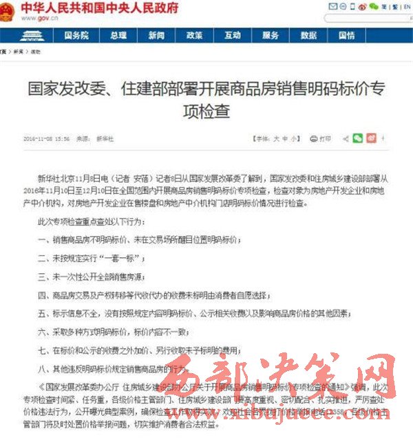近日,國家發(fā)改委及住建部聯(lián)合發(fā)布了對(duì)商品房“明碼標(biāo)價(jià)”的新一輪整治措施。部署從2016年11月10日至12月10日在全國范圍內(nèi)開展商品房銷售明碼標(biāo)價(jià)專項(xiàng)檢查。此次專項(xiàng)檢查重點(diǎn)查處以下八類行為。“明碼標(biāo)價(jià)”、“一套一標(biāo)”、“醒目”、“自愿”、“一致”成為重點(diǎn)關(guān)鍵詞。
