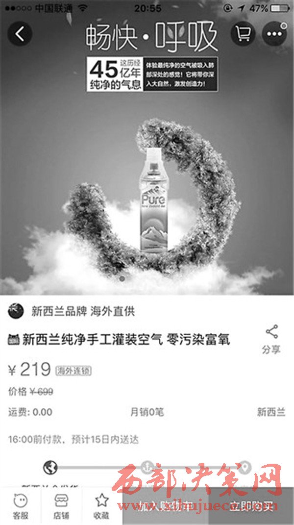 那么“空氣”到底屬于什么產(chǎn)品類別呢?“新西蘭純凈手工灌裝空氣”店主表示,有倉庫在新西蘭,但被問及有無商標(biāo)時,店主只表示是“新西蘭原裝進(jìn)口”,而在進(jìn)口的時候是以什么類別進(jìn)口的呢?店主表示“不清楚。”