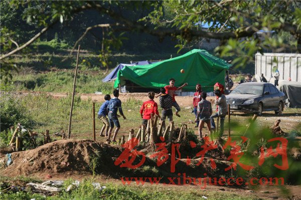 據(jù)邊民張賽亞稱,20日當天早晨7點多,村子里聽到槍炮聲,村民們生怕被流彈所傷開始逃跑躲避,他家住在畹町河岸,他看到除了橋上騎著摩托車往中國的村民,河里還有蹚水的村民成群結隊,他們也就跟著跑到了中國,家里的牛羊那些現(xiàn)在無人照看,村里只留有少部分人,他們出來的不敢回去。在安置點能吃飽睡好,等過一陣子再回去看看。圖為一群緬甸小孩在岸邊踢足球。