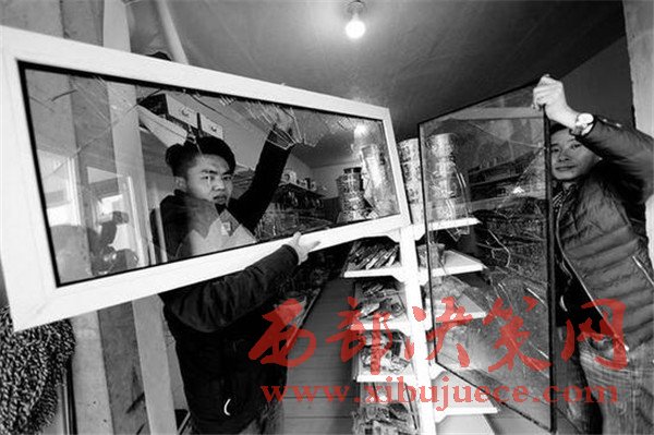 令趙女士沒(méi)想到的是,27日下午5點(diǎn)多,這群人又出現(xiàn)了。當(dāng)時(shí)趙女士的兒子田江正在里屋吃飯,外面的防盜門虛掩著,突然七八個(gè)男子帶著洋鎬把就沖了進(jìn)來(lái),沖著貨架一通亂砸。田江說(shuō):“我聽(tīng)見(jiàn)響動(dòng)掀開(kāi)門簾出來(lái),都是蒙面的小伙,我聽(tīng)清楚了對(duì)方的一句話‘還敢開(kāi)還砸!’,我當(dāng)時(shí)看著對(duì)方人多,沒(méi)敢追。”目前,趙女士一家已經(jīng)報(bào)警,韋曲派出所正對(duì)此事做進(jìn)一步調(diào)查。