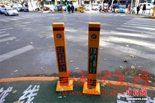 12月5日,西安市建國路一十字路口,數個紅綠燈“提示樁”矗立在路口,“紅燈禁行”“綠燈通行”等字樣交替出現,并伴隨紅燈閃爍。