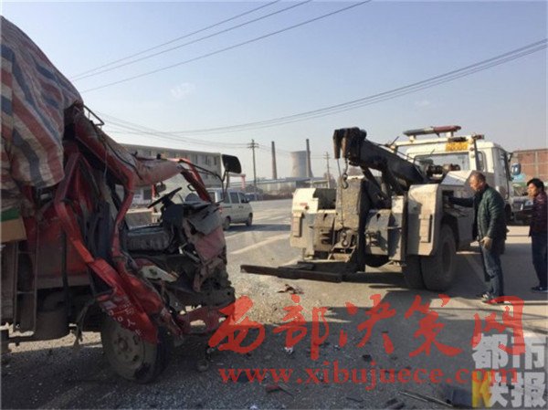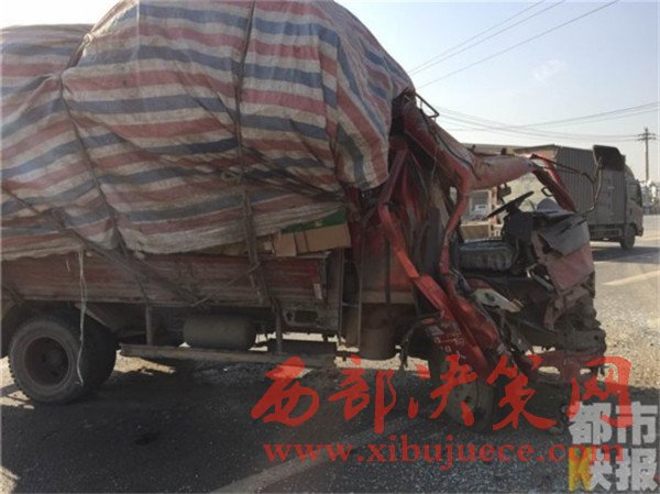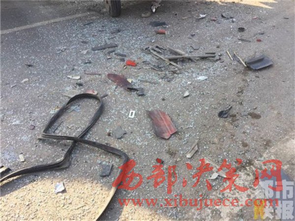 記者在事發(fā)地108國(guó)道西安市戶縣境內(nèi)看到,被撞的小貨車已經(jīng)面部全非,前部完全破損。而在這邊一輛拉沙車已經(jīng)沖到了路基下,發(fā)生傾斜。