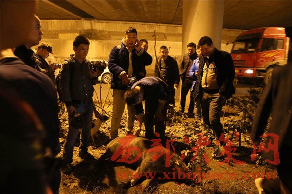 19:15,再次發(fā)現(xiàn)野豬蹤跡,它被狗攆著跑出了區(qū)政府大院,鉆到附近高速路橋下涵洞里。人群正準備再次抓捕,一輛白色別克轎車駛過,“二師兄”被撞出十多米遠,這下再沒起來。