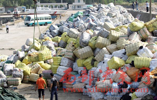 深圳海關(guān)查獲銷毀千余噸走私的舊衣物,圖為堆放在碼頭的舊衣物