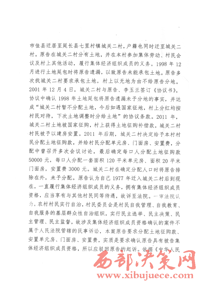 西部決策網(wǎng)訊(記者 封營庫 實習(xí)記者 李延梅)陜西延長縣七里村村民李果花反映稱:“1977年我從榆林市佳縣遷居至延長縣七里村鎮(zhèn)城關(guān)二村,戶籍也同時遷至城關(guān)二村。我在城關(guān)二村分有土地,并在本村參加集體勞動村民會議及村上其它活動,履行集體經(jīng)濟組織成員的義務(wù)。1998年12月進(jìn)行土地延包時將我遺漏,以致我未能承包土地。我多次找城關(guān)二村要求承包土地,村上以無地為由不給我分地。2001年12月4日,城關(guān)二村與我、李玉蘭簽訂《協(xié)議書》,協(xié)議中確認(rèn)1998年土地延包時將我遺漏未有分地的事實,并達(dá)成“城關(guān)二村暫不分配土地,今后如遇國家征地,村上分紅均按村民對待,下次土地調(diào)整時分給土地”的協(xié)議條款。2011年,城關(guān)二村土地被國家征購,村上獲得土地征購補償款,城關(guān)二村村民被予以建安置房。2011年后期,城關(guān)二村決定給予本村村民分配土地征購款,并給村民分配單元房、門面房、安置費,分配中曾召開多次會議討論,最后確定每口人分配土地征購款50000元,每口人分配一套面積120平米單元房,面積20平米的門面房,安置費5000元,城關(guān)二村在確定人口時將我排除在外,未予分配。我認(rèn)為自己1977年遷入城關(guān)二村后到現(xiàn)在,一直履行集體經(jīng)濟組織成員的義務(wù),擁有集體經(jīng)濟組織成員資格,應(yīng)當(dāng)享有與其他村民同等待遇,故訴至延長縣人民法院要求判令城關(guān)二村給予我分配土地征購款50000元,安置單元房一套(120平米)、門面房20平米,安置過渡費5400元。但被延長縣人民法院以涉及集體經(jīng)濟組織成員資格的案件不屬于人民法院管轄的民事訴訟,駁回起訴。我又上訴至延安市中級人民法院,但又用同樣的理由又被駁回上訴。我該怎么辦?真的天下烏鴉一般黑嗎?我訴訟的是要回屬于我的征地款、安置房、過渡費,我有合法的戶口簿、身份證。又有延長縣城關(guān)鎮(zhèn)政府副鎮(zhèn)長張世杰、包村片長趙華強、包村干部白醫(yī)學(xué)、城關(guān)村村主任(二村村民)董志軍、二村村長趙金星,原二村會計王連平,原二村代表老村長丁興元,在鎮(zhèn)政府會議室簽訂的協(xié)議書。難道我的村民資格還要確認(rèn)嗎?我村村長董志軍的兒子董飛戶口也不在我村,又是公務(wù)員,現(xiàn)任延長縣紀(jì)律檢查委員會案件審理室主任,還有村長董志軍他父親。董長春早已去世,但也同樣分的征地補償款,安置單元房,安置過渡費。望你們新聞媒體深入調(diào)查,將事實公布于眾,為我申冤,維護我的合法權(quán)益。”