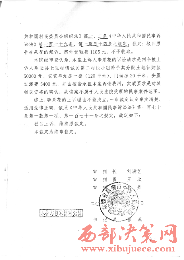 記者又多次翻閱了延長縣人民法院(2016)陜0621號民初541號民事裁定書和延安市中級法院(2016)陜06民終1658號民事裁定書,兩級法院都用同樣的理由是:“李果花的訴訟請求是判令被上訴人延長縣七里村鎮(zhèn)城關(guān)二村民小組給予其分配土地征購款50000元,安置單元房一套(120平米),門面房20平米,安置過渡費5400元,并由被告承擔(dān)案件訴訟費用,實質(zhì)要求是對其村民資格的確認(rèn),故該案不屬于人民法院受理的民事案件范圍。”一審法院駁回起訴,二審法院是駁回上訴,維持原判。正如反映人李果花稱:“我訴訟的是要回我合法的土地征購款、安置房、門面房、安置過渡費。村民的資格確認(rèn),我有的合法的戶口簿、身份證,又有鎮(zhèn)政府領(lǐng)導(dǎo)、村干部、村民代表的協(xié)議書還不夠嗎?”