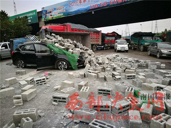 12月24日中午,在柳州市柳長路北外環(huán)立交橋底,一輛寶駿越野車準(zhǔn)備掉頭時,后方一輛運磚車剎不住導(dǎo)致翻車,一堆磚頭把這輛寶駿車埋了。