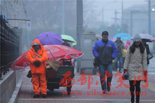 2016年12月26日一早,山東濟南,天空中飄著細(xì)細(xì)的雪花,一位環(huán)衛(wèi)工人靠在路邊站著睡著了,記者看到,這名環(huán)衛(wèi)工人還懷抱掃把和簸。