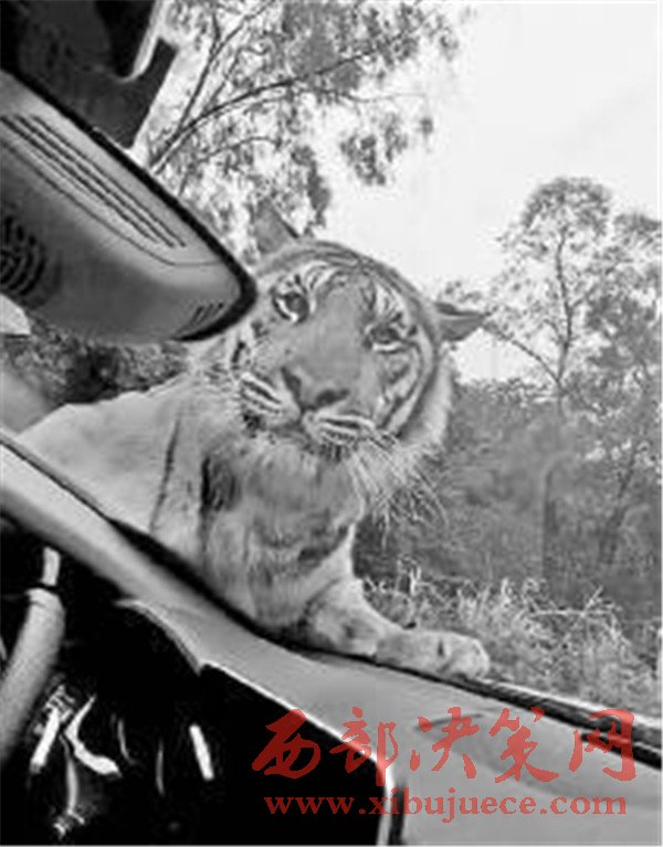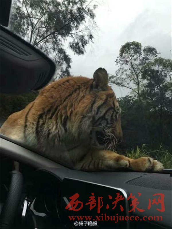 媒體分享的照片顯示,在樂(lè)和樂(lè)都自駕體驗(yàn)區(qū),一只體型巨大的老虎攔下了一輛游客車輛,隔著擋風(fēng)玻璃向車內(nèi)張望,隨后又直接趴在了引擎蓋上。觀察到這一情況后,園區(qū)的工作車輛迅速趕到,將老虎驅(qū)離,整個(gè)過(guò)程有驚無(wú)險(xiǎn)。