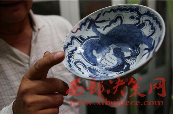 2016年9月23日,陜西榆林,清乾隆青花瓷過(guò)橋龍圖案從碗外延伸到碗內(nèi)。