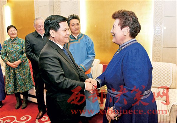 1月16日晚,自治區(qū)黨委書記李紀(jì)恒在觀看大型蒙古族歌劇《愛在胡楊》演出前,接見了總策劃德德瑪?shù)染巹?chuàng)人員。