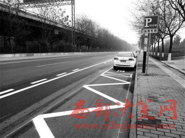 記者現(xiàn)場(chǎng)看到,如廁停車位大多緊鄰公廁,設(shè)置在道沿下的路邊,白色的波折線,前方設(shè)置一個(gè)或兩個(gè)臨時(shí)停車位,停車位采用黃色起止標(biāo)線,標(biāo)線內(nèi)寫有“如廁專用”大字。緊鄰?fù)\囄坏穆愤?,設(shè)有牌,停車牌上寫著“15分鐘”的停車時(shí)限。
