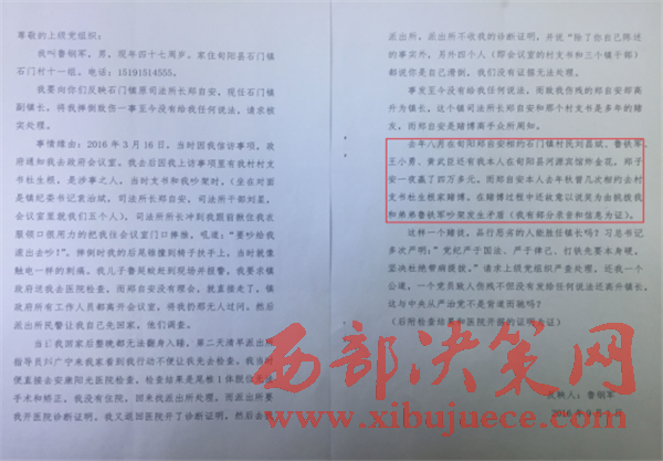 當事人魯鋼軍于2016年3月16號在石門鎮(zhèn)政府會議室被傷,而致他受傷的當事人鄭自安還升任石門鎮(zhèn)副鎮(zhèn)長,而這個新任鎮(zhèn)長鄭自安就是上訪人向旬陽縣委組織部實名舉報長期聚賭的主要人物。而鄭自安賭博并非偶爾賭一兩次,而是長期聚賭,鄭自安和上訪人魯鋼軍結怨就是在前幾年上訪人在上訪過程中認識的。鄭自安讓上訪人介紹賭友認識聚賭而對上訪人有怨氣。石門鎮(zhèn)難道是特區(qū)要以賭博產(chǎn)業(yè)為龍頭嗎?否則怎么會讓一個賭徒任鎮(zhèn)長?2016年3月16日在鎮(zhèn)政府辦公室致使魯剛軍尾椎體滑脫,造成多日生活部分失去自理能力。就因種種事由,魯剛軍曾多次向旬陽縣紀委、安康市組織部、安康市紀委反映,至今未得到妥善處理。