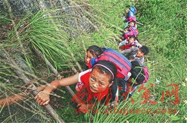 曾經(jīng),孩子們背著沉甸甸的書包,每天爬藤梯上下學。
