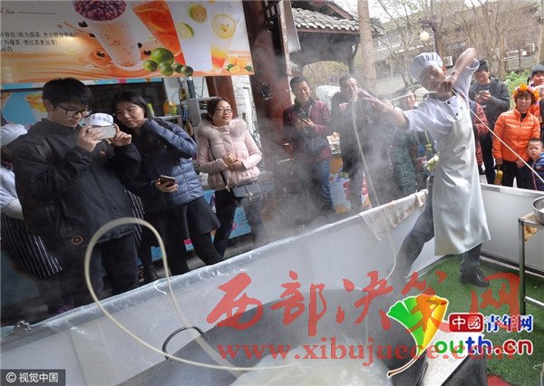 "我當(dāng)時就想著搞點(diǎn)花樣,來招攬客人。"田波告訴記者,一開始他只是簡單地扭幾個動作,把原來扯面的動作,變得更花哨。