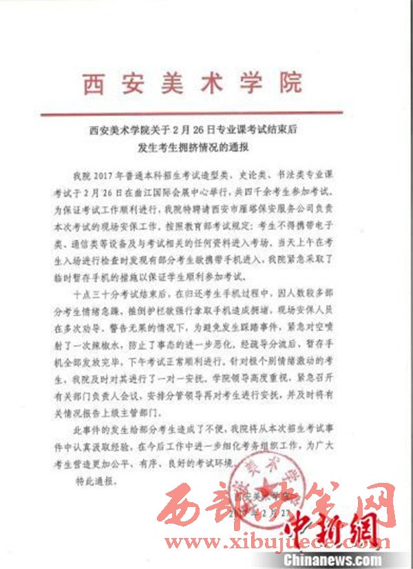“因?yàn)榻衲瓯拘W(xué)生到校較早,學(xué)校沒有空閑教室,所以首次在校外場地進(jìn)行招生考試。”西安美院宣傳部工作人員向中新網(wǎng)記者表示,校方對新場地的規(guī)劃不足,是導(dǎo)致這次事件的主要原因。