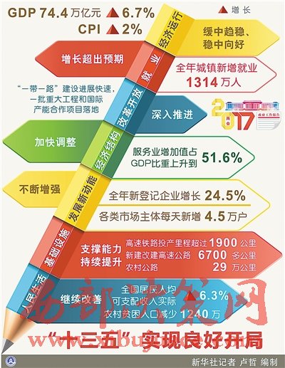 經(jīng)濟(jì)運(yùn)行緩中趨穩(wěn)、穩(wěn)中向好。國內(nèi)生產(chǎn)總值達(dá)到74.4萬億元,增長6.7%,名列世界前茅,對全球經(jīng)濟(jì)增長的貢獻(xiàn)率超過30%。居民消費(fèi)價格上漲2%。工業(yè)企業(yè)利潤由上年下降2.3%轉(zhuǎn)為增長8.5%,單位國內(nèi)生產(chǎn)總值能耗下降5%,經(jīng)濟(jì)發(fā)展的質(zhì)量和效益明顯提高。