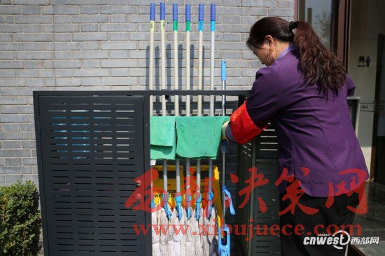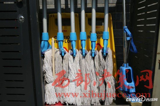 3月8日,西安環(huán)城公園一公廁門口的拖布柜里整整齊齊放著全套拖布,有男衛(wèi)、女衛(wèi)、門廳管理房專用的干濕拖布。
