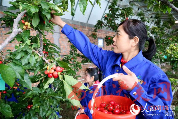 3月8日,在新疆生產(chǎn)建設兵團第八師一三四團華蓉櫻桃園里,紅紅的櫻桃掛滿枝頭,員工們正在采收成熟的櫻桃。