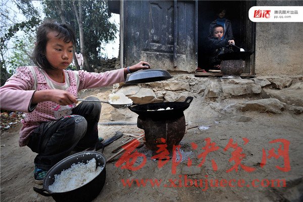 圖為2011年3月31日,在貴州羅甸縣班仁鄉(xiāng),學(xué)生在每學(xué)期開學(xué)的時(shí)候,除了背書包去上學(xué)以外,還要帶著爐灶和鍋碗瓢盆等。包括一年級(jí)學(xué)生在內(nèi),在學(xué)校他們每天必須自己生火做飯。