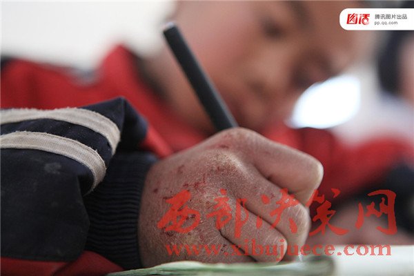 圖為2011年12月28日,山西省長治市沁縣池堡寄宿小學(xué),一名手凍裂口的小學(xué)生在寒冷的教室內(nèi)寫作業(yè)。