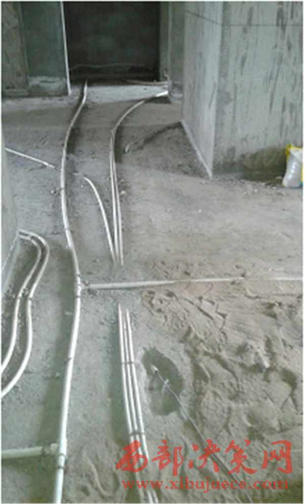 記者跟隨馬某某來到7層其新房。新房里,客廳、臥室、廚衛(wèi)地面上,白色管道到處穿行,一片狼藉。馬某某指著客廳靠中心的一處地方告訴記者: