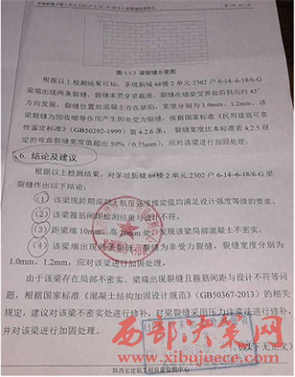 最早有兩戶村民投訴舉報,小區(qū)的物業(yè)公司出資委托陜西省建筑工程質(zhì)量檢測中心進行鑒定,結(jié)論如下: